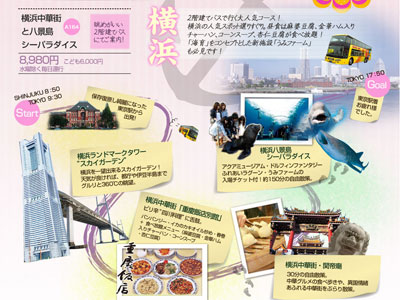 ネットで調べてみると、はとバスでは「横浜ベイサイドストーリー」のほか、「中華街と八景島シーパラダイス」「ヨコハマナイトストーリー」などの横浜を巡るツアーを運行している。