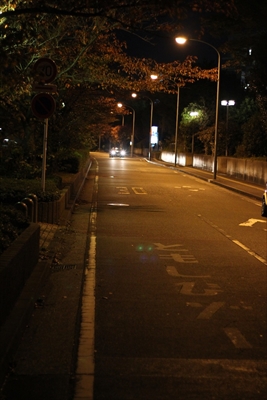 日産スタジアム寄りのこの位置、車はポツポツ通る程度だが、街灯がオレンジ色に光っているので車道・歩道ともに結構明るい。