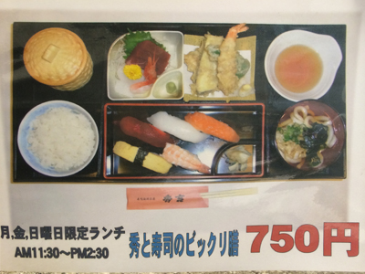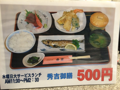 「秀吉御膳」は、焼き魚に刺身、天ぷらまでセットになっていた。どちらも、茶碗蒸しとみそ汁まで付いてくる。これで500円と聞けば、「土曜日限定ランチ」への期待も高まる。