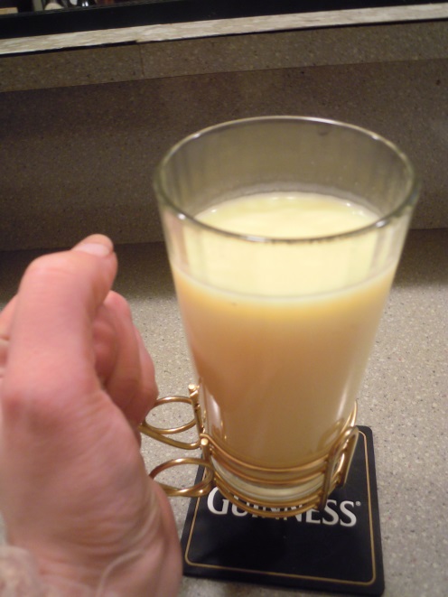 寒さのあまり震えが止まらないので、あたたかいお酒を注文することに。すると、卵のリキュール「アドボガード」を使ったオリジナルカクテル(500円)を出してくれる。