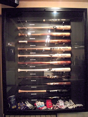 石川、ブランコ、金城選手などのバット。形や長さの違いがよくわかる