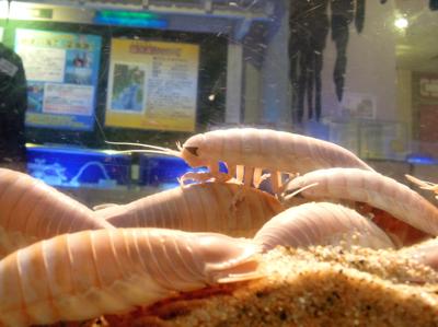 「深海ゾーン」の仲間たちは、国内で捕獲できない「ダイオウグソクムシ」以外、すべて名誉館長の長谷川さんの手によって捕獲されたもの。本日の食材ももちろん長谷川さんの提供。ではご登場いただこう。オオグソクムシさ〜ん!