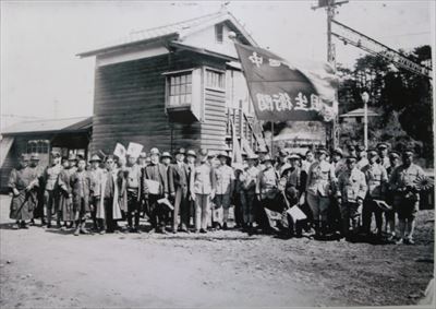 戦時中の上大岡駅前で撮られた出征前の集合写真(提供:渡辺渥美)