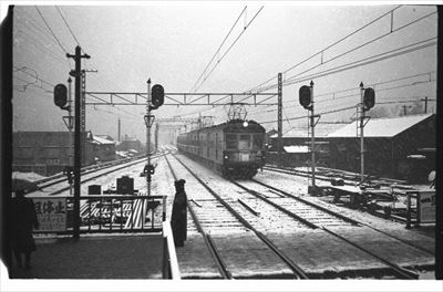 1959(昭和34)年、雪の日の上大岡駅構内(提供:渡辺渥美)