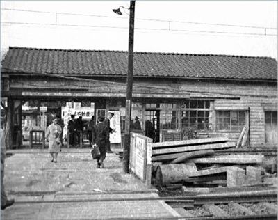 1961(昭和36)年、ホーム側から踏切越しに見た駅舎(提供:渡辺渥美)