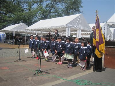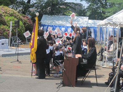 そして、千手院幼稚園の園児たちによる「賛仏歌」の歌唱。両親、そして仏に対する感謝を表す歌である。小さな体で合掌し、日の丸の小旗を振る姿がかわいらしい。
