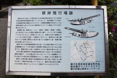 根岸飛行場は、1940(昭和15)年に、大日本航空株式会社によって作られた、日本で初めての飛行艇専門の民間飛行場で、南洋諸島パラオ島への定期航空路が開設され、終戦直後の1945(昭和20)年9月に台湾に向けて紙幣の輸送をしたのが、この飛行場からの最後の飛行である。
