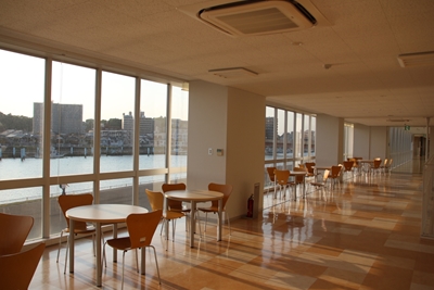 笑顔で出迎えてくれた遠藤先生にさっそく話を聞いていく(写真はNG)。案内されたのは、カフェテリア(食堂)の隣にあり、鶴見川を一望できるリバービューラウンジ。
