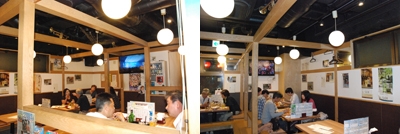 日ノ出町駅前店は、約180席ほどとかなり大きな店舗だが、テーブル席、カウンター席がある1階には3台、広間、ボックス席、テーブル席、個室がある2階には5台のモニターが設置されている。