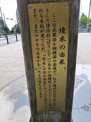 「ここは武蔵国と相模国の国境で、江戸時代にはそのしるしとして傍示杭(ぼうじぐい)、あるいは境杭(さかいぐい)と呼ばれる木柱が建てられたことから、地名が境木になったと伝えられている」と書いてあった。