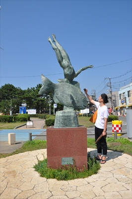 大きな魚に片手で倒立している、江ノ島漁港にある「海の詩」という銅像の意味がわからないので、知りたい。またモデルは本当こんな格好ができたのかな?(hozupiさんのキニナル)