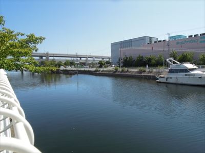 背の低い街並みと目の前を流れる掘割川(ほりわりがわ)が印象的な施設。
