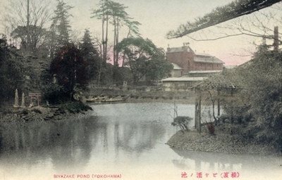 後のジャパン・ブルワリー(後述)の手前に「ビヤ酒ノ池(天沼)」が写る写真絵葉書