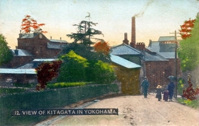 向こうに醸造所が見える写真絵葉書「横浜北方の眺め」(提供:yokohama postcard club)