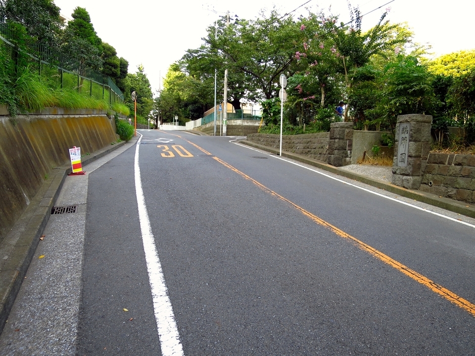 ビヤ坂側には「麒麟園」と書かれた古い門の跡。向かい側の路側帯もやや広い