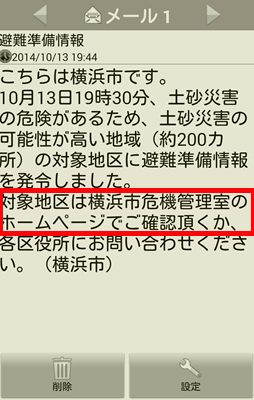 このメールは、横浜市が同月10日(金)にリスト化した市内約200ヶ所の危険な崖地付近の住民に対して避難準備を促した「緊急速報メール」で、リストで危険な崖地がなかった瀬谷区を除く17区約358万人に送られた。