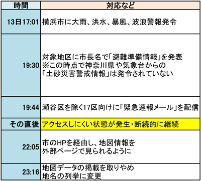 このため、市は午後10時過ぎに地図データのみを外部サイトで閲覧できるようにしたが、アクセス障害が解消されなかったため、午後11時16分に地図データの掲載を取りやめ、危険な地域の地名の列挙に切り替えた。