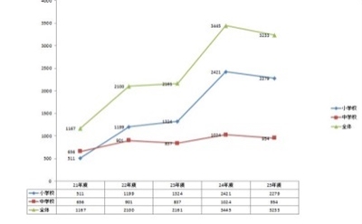 小学校で 2279 件(対前年度比5.9%減)、中学校で 954 件(同6.8%減)、全体では 3233 件で 212 件(同6.2%減)減少しているものの、過去5年間の中では高い数値を示している。自殺は「重大事案」としてカウントするが、横浜市内ではそこに至るまでのケースはなかった。