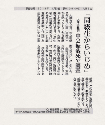 2011(平成23)年10月に、滋賀県大津市で同級生からいじめを受けたという中学2年の男子(当時13歳)が自殺をする、という事件が起きた。