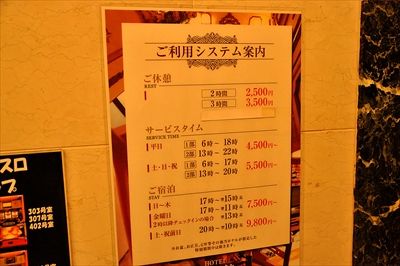 利用料金表。一部の部屋は「ショートタイム(ご休憩)」が適用されないので要確認