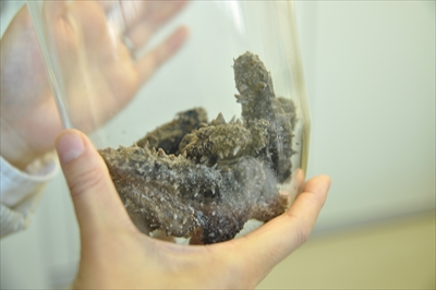 そのツッコミに激しく同意する筆者に、瓶詰の乾燥ナマコを見せてくれた置田さん。2月~3月のシーズン中に、本牧漁港の出荷所で観察がてら笊(ざる)に乗せて3日間天日干し、元の3分の1~4分の1ほどにまで縮ませたものだ。乾燥ナマコは人差し指にも満たない大きさで、黒くカチンコチンに乾いた本体は、一見すると猫のフ○みたいである(失礼)。たしかに、コレが中国ではそんなに高いのかァ・・・?