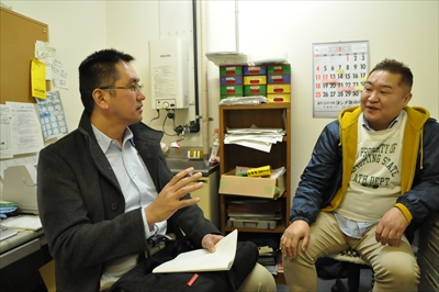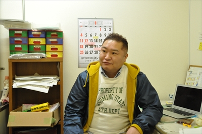 坪井食品の事務所で、筆者のインタビューに答える坪井社長