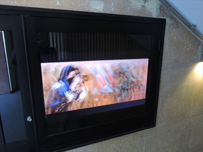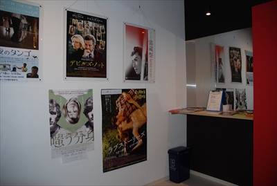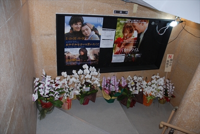 上映中の映画ポスターを掲示。オープン祝いの花が華やか