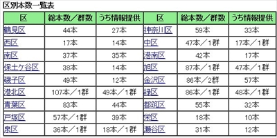 名木古木ページの区ごとにまとめられたリスト。全部で979本ある