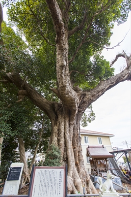 そこで目通り周の大きい木を「横浜市の名木古木」リストから探してみると、旭区西川島の嶋崎金子稲荷社にあるタブノキが幹周5.4メートル。こちらは株立ちではなく、1本立ちだ。