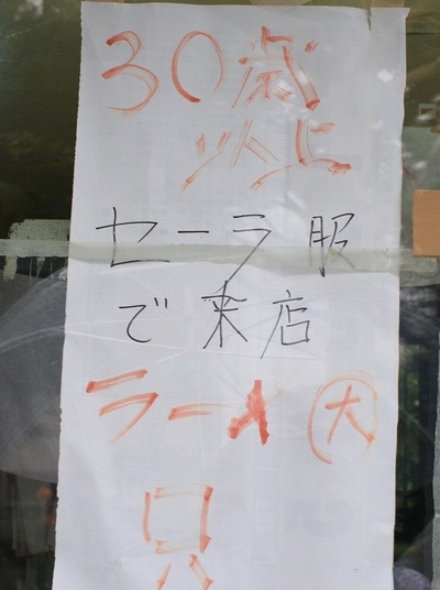 店の前に手書きで書かれた貼り紙には「 30歳以上 セーラ服で来店 ラーメ 大 只 」と書かれている。ところどころ日本語がおかしいが、間違いないだろう。