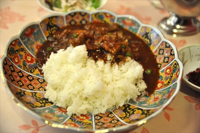 こちら馬車道ハヤシライス。有田焼のたっぷりした器でいただく。豊かな気持ちになれます。