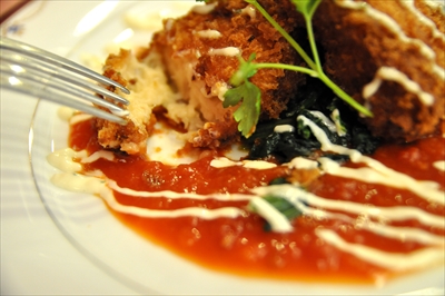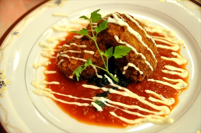 コロッケの下にはホウレンソウのソテーがしいてあるよ