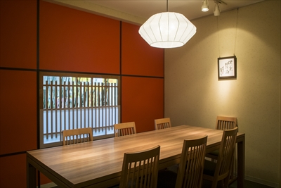 テーブルは10席。赤い壁が印象的な個室は6~7人で利用できる
