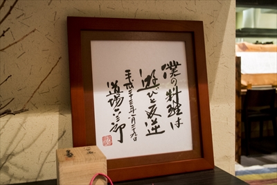入口の色紙に「僕の料理は 遊びと反逆 道場六三郎」とあり「かわかみ」の開店日が入っている