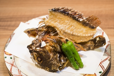 立体的に盛られた姿が食欲をそそる、カサゴ唐揚げ