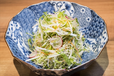 このサラダは、河上さんの包丁技を思い切り楽しめる1品だ。よく研がれた包丁を使い、押しつぶさない、なめらかな包丁技の技術を駆使して切られているので余計な水気が出てしまわず、シャキシャキとみずみずしい。そんな中、太さの違う水菜や紫蘇(しそ)が楽しいアクセントになっている。