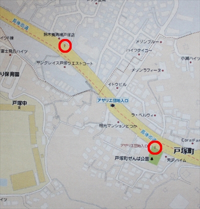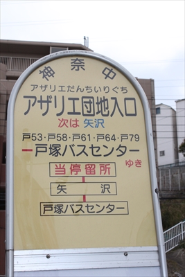 アザリエ団地入口の信号から長後方面へ行くバス停は約150メートル、戸塚駅方面へ向かうバス停は約175メートルで、2つのバス停間の距離は、約325メートルも離れている。これでは“アザリエ団地って何だろう?”と疑問に思うわけである。