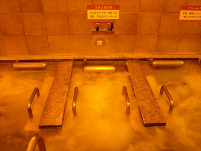 「どんなヒトでも浮き上がる 全身浮き上がりマッサージ」とあるように、寝ころんだ状態で入るジェットバス。泡の勢いが強めで、体がプカーっと浮き上がってしまうお風呂だ。