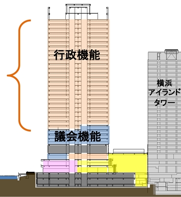 1階は、みなとみらい線馬車道駅を経由して隣接する「横浜アイランドタワー」と直結させ、市民だけでなく観光などで横浜を訪れた人が集えるアトリウムや水辺で憩える空間を整備。2階は市民協働スペース、情報提供スペースなどにして3階以上に市庁舎機能を置く。