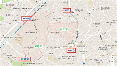 横浜市営地下鉄「新横浜駅」・「岸根公園駅」、東急東横線「菊名駅」・「妙蓮寺駅」の位置関係は、このような感じ。この4駅のどこかを徒歩圏内に、形成された住宅街。それが今回の調査区域、港北区篠原町・富士塚。