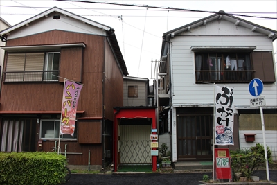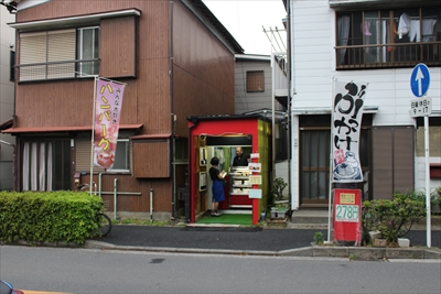 家と家の間にちょんと建っている赤い店舗。これが件の「名前のない弁当屋」だ。