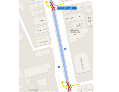 真ん中を川が流れる「あざみ野駅入り口」から「寛永寺(かんえいじ)下」までの1.5kmの区間まで調べると、一方通行の橋は7ヶ所あり、3ヶ所(1ヶ所は歩行者のみ通行可能)はフェンスで閉鎖されていた。確かに投稿者の言うとおり、美しが丘4丁目だけで2ヶ所、通行できない場所があった。
