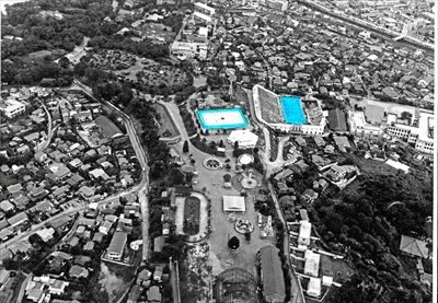 1949(昭和24)年3月~6月、横浜の復興躍進を祝い、繁栄を図るために日本貿易博覧会が開催された。第2会場だった野毛山には景観を添えるため噴水池を設置。噴水池の築造にあたっては50メートルプールに転用できるよう意図して設置されていたという。