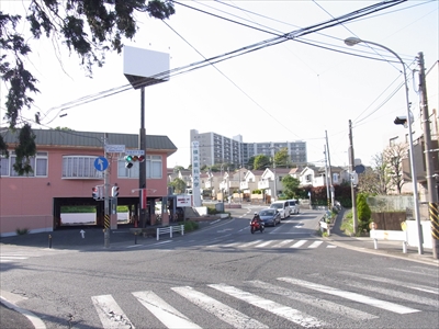 そして福泉寺(ふくせんじ)の交差点のあたりから、住宅地方面をのぞむと、斜めに傾いた大きな板の姿に気づく。