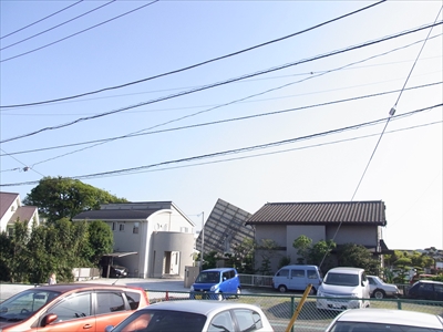 見る角度によっては住宅の上から板がつき出ているように見えるが、よく見ると住宅地の奥にある空き地に建てられた、支柱の上に板が設置されていることが分かる。