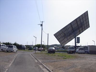 駐車場を経営する地主が土地の有効活用の目的で建てた、巨大なソーラーパネル。発電された電力は東京電力に売っている。
