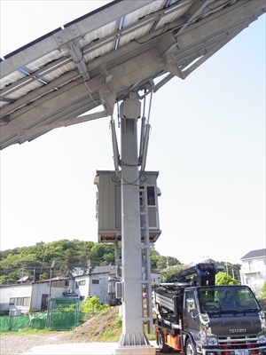 続いてパネルの稼働の仕組みに関して伺うと「ボックスの中には油圧式の稼働システムとともに気象庁の季節ごとの太陽の位置に関するデータが入ったコンピューターが設置されていて、1時間に1回角度を調節してくれます」