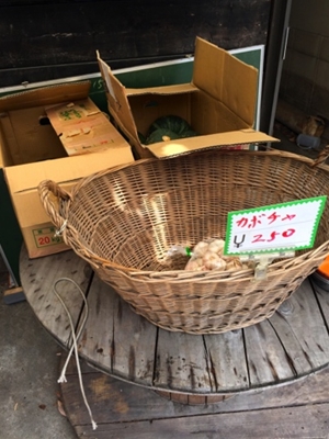 店頭の一角にある売り物と思しきカボチャとニンニクだけが、唯一のお店らしいコーナー。