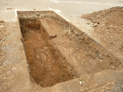 アスファルト舗装の下にレンガの建物基礎が。すぐ上には破砕されたガレキ片