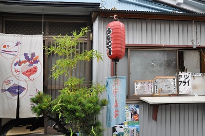 テイクアウト用の小窓と赤い提灯、ラムネの涼しげな旗。